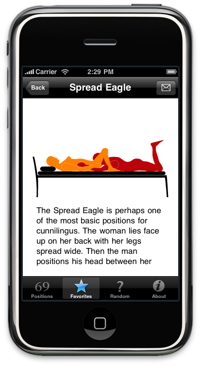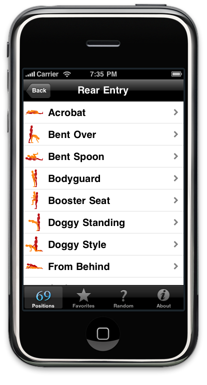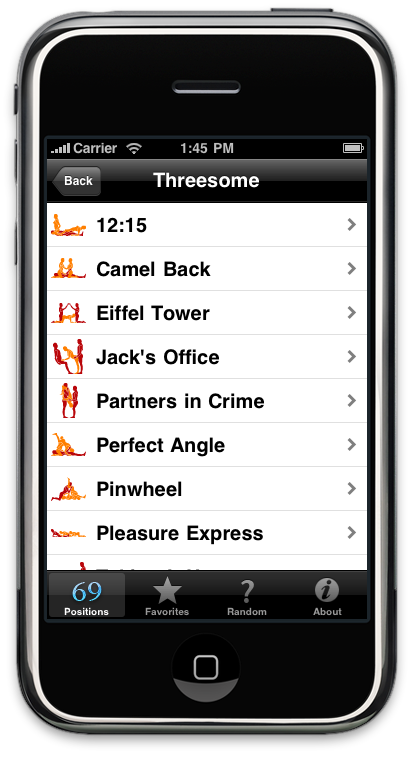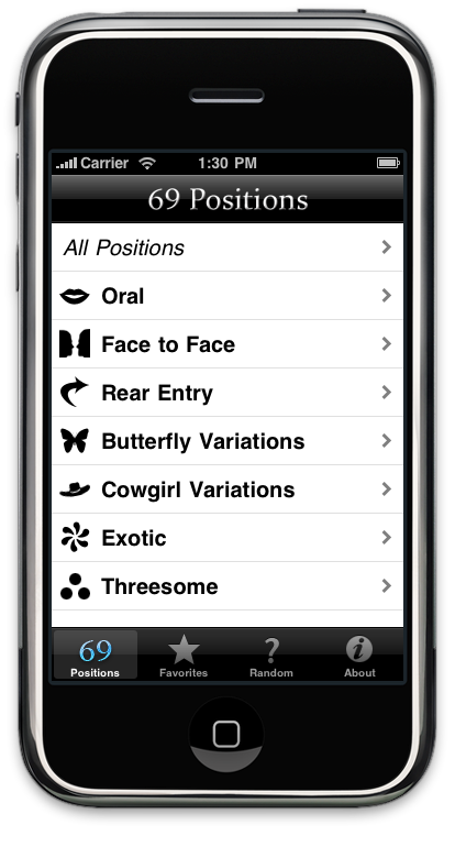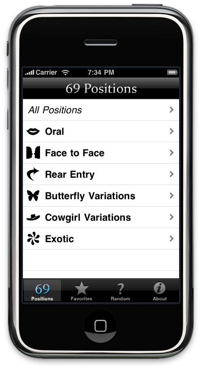 Update 1.2 of 69 Positions was recently released on the App Store. This update adds shake support to the Random page and also adds favorite icons to the Positions and Random pages, letting you quickly add/remove favorites from your list. Be sure to rate the new update in the App Store after downloading!